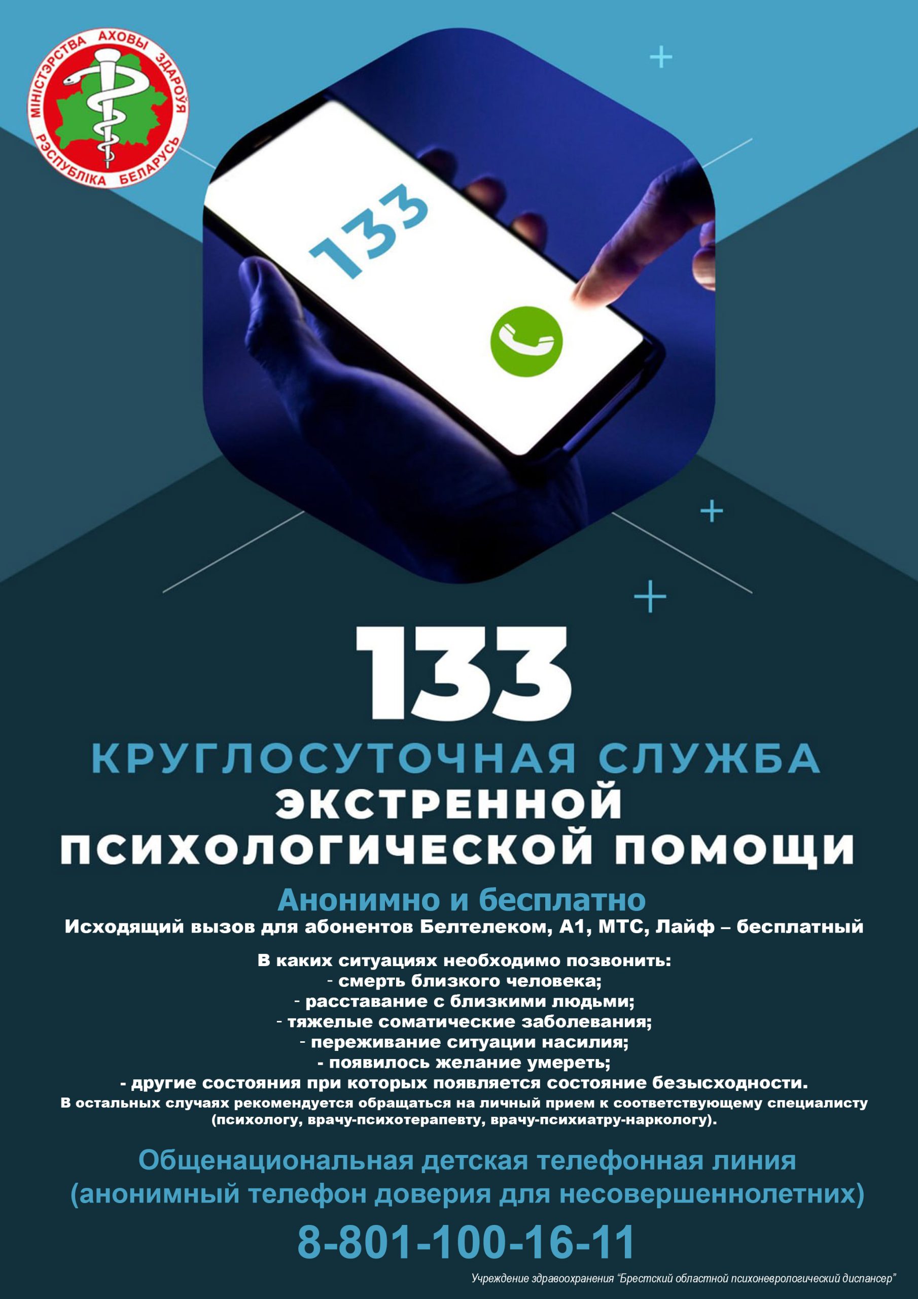 экстренной психологической помощи по номеру телефона 133.