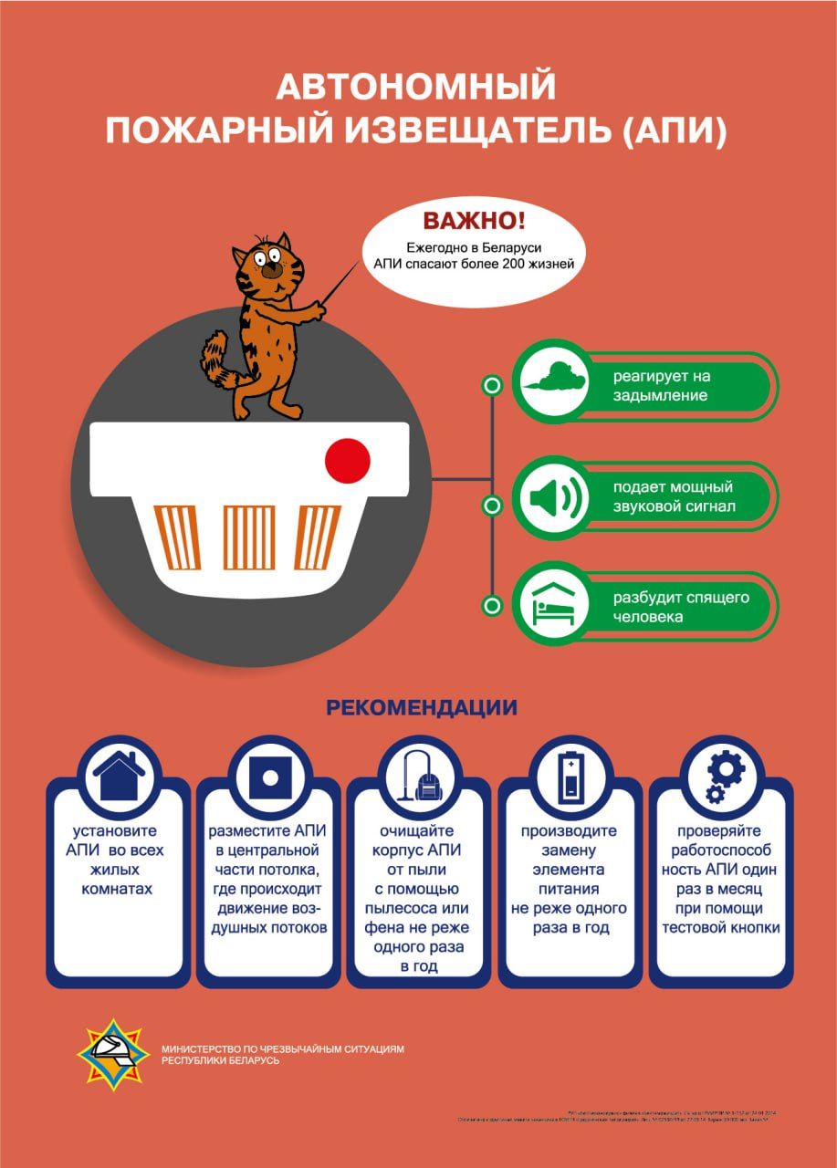 МЧС напоминает: в соответствии с законодательством Республики Беларусь ответственность за соблюдение требований пожарной безопасности в жилых домах, принадлежащих гражданам на праве частной собственности, возложена на их собственников. Поэтому проверьте на работоспособность автономные пожарные извещатели, а в случае их отсутствия – установите их в жилых помещениях домовладения. Обратите внимание на исправность отопительного оборудования и электрической проводки. Не оставляйте детей без присмотра взрослых!