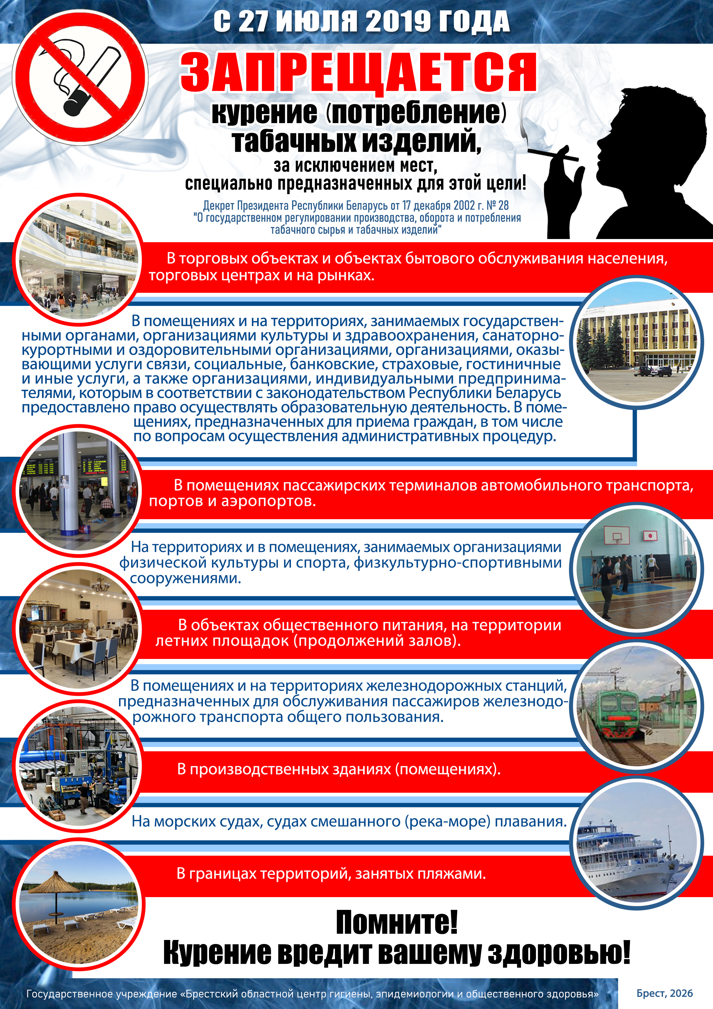 Одним из важных вопросов остается выполнение требований антитабачного законодательства в части запрета курения в местах, определенных Декретом Президента Республики Беларусь от 17.12.2002 № 28 «О государственном регулировании производства, оборота и потребления табачного сырья и табачных изделий».